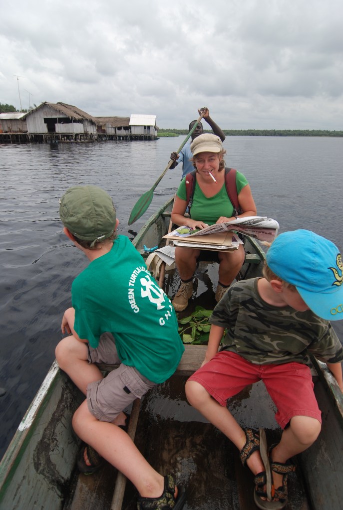 Tinde on fieldwork in in 2010 in Nzulezo in southern Ghana with her two children (Picture by their father Christiaan van der Hoeven).