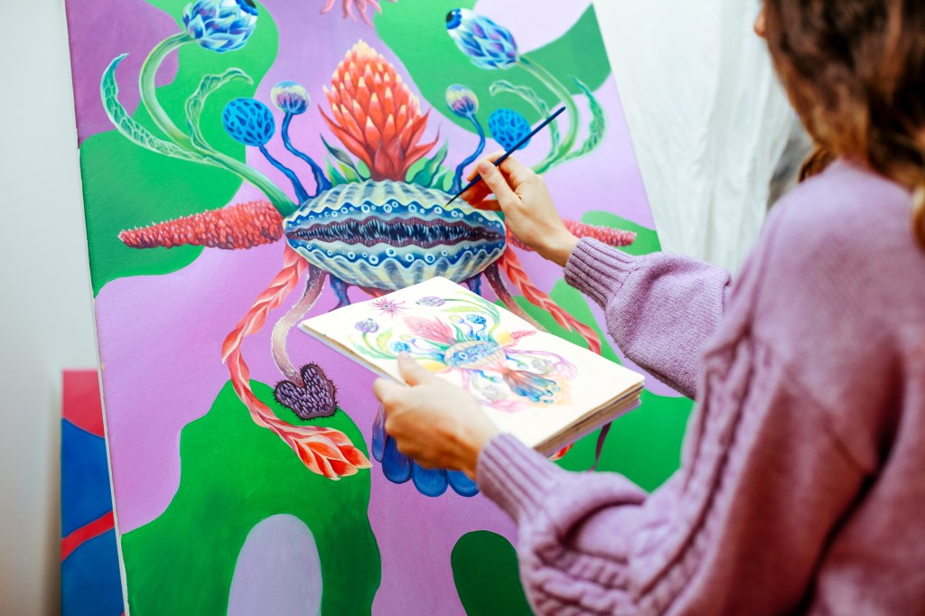 As an artist, I not only use my art as a tool to connect with plants on multiple levels, but also to bring attention to these organisms, so often overlooked or thought of as inferior. In Braiding Sweetgrass, Robin Wall Kimmerer writes about reciprocity with the natural world and indigenous knowledge: “In the indigenous view, humans are considered somewhat lesser beings in the democracy of species. We are referred to as the younger brothers of creation. So, like younger brothers, we must learn from our elders. Plants were here first and have had a long time to figure things out.” In my paintings, plants, slime molds, flowers, and microscopic organisms are the main heroes, alive and looking back at the viewer while mesmerising her with their infinite colours and shapes, whispering: We are you, and you are us. By stepping into our world, you move closer to your own nature.