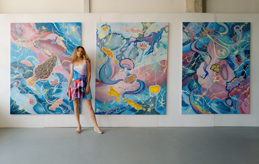 Crucial to my artistic practice is working with mind-altering plants and mushrooms. Discovering the world of psychedelics, collecting indigenous knowledge from different cultures, and researching psychedelic philosophy added a much deeper layer to my work. explore the “existence of an intelligent Other” and the concept of the “vegetable mind,” as described by Terence McKenna in Food of the Gods, through intense colors and fluid forms informed by psychedelic experience. Capturing a sense of continuous flow and transformation is essential to my work. As Czech psychiatrist Stanislav Grof described, psychedelics function as a microscope for the mind, just as scientific microscopes do for biology. In my artistic practice, science and entheogens are inseparable and complementary.