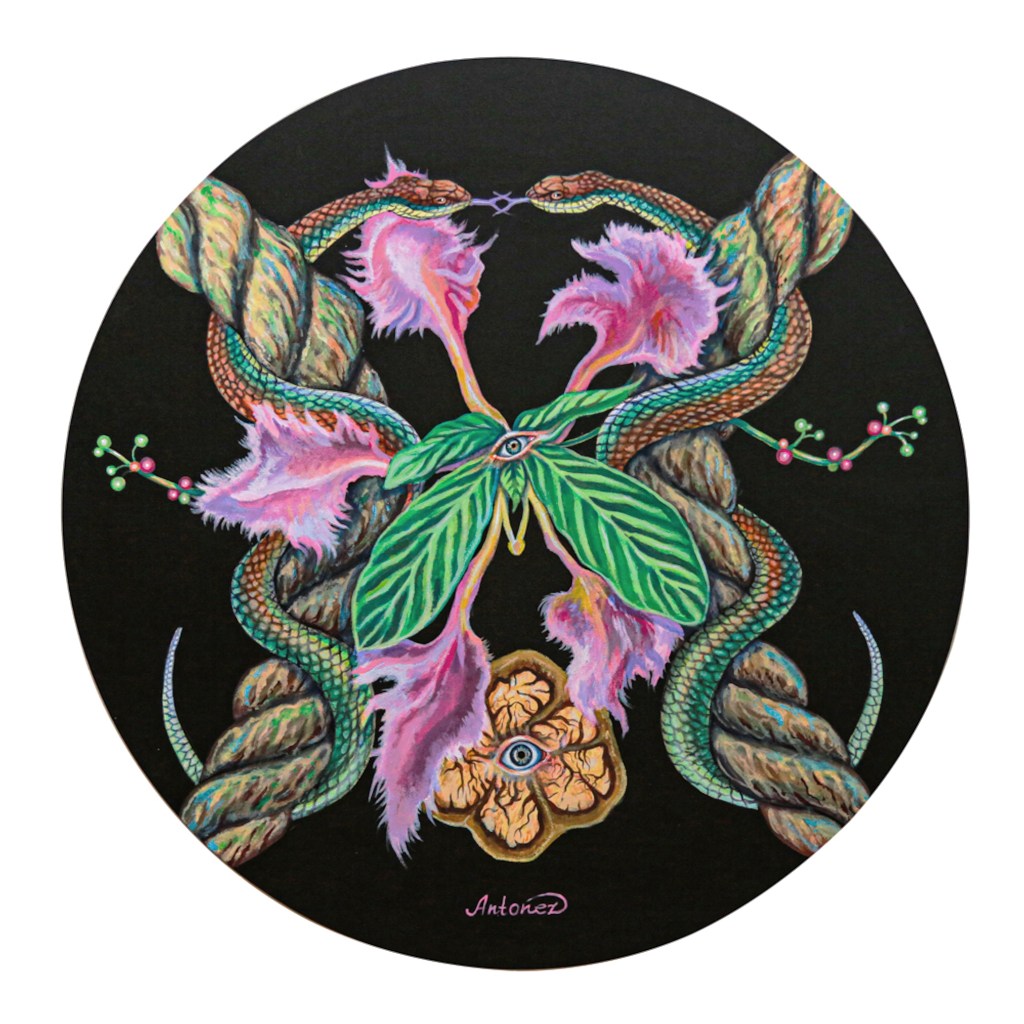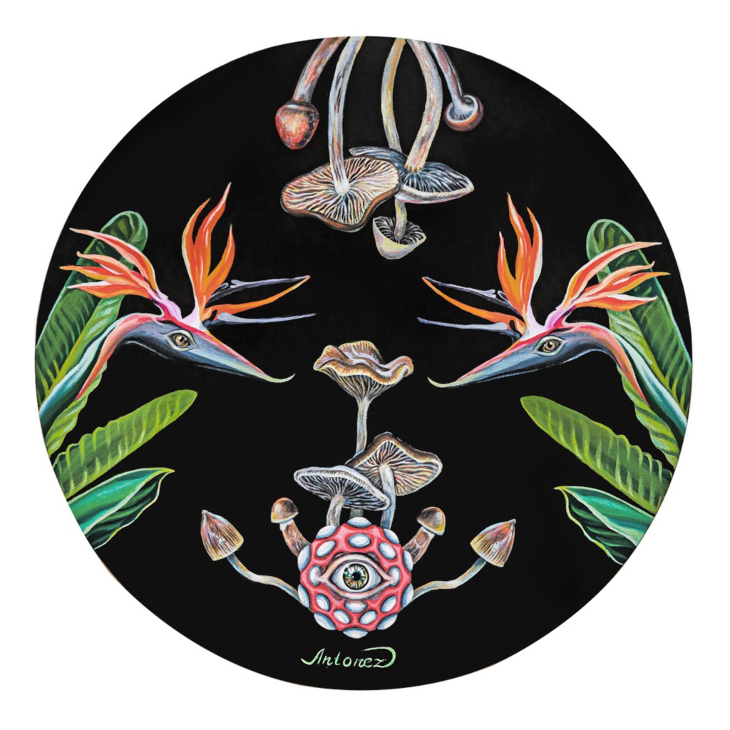 Antonez’s work has been showcased in various group shows and solo exhibitions alongside art festivals such as All Things Fungi Fest (UK), Pilz Fest (AT), Fenix Fest(CZ), Fungi Fest (DE) Ozora Fest (HU), with pieces in private collections worldwide. She has been featured on podcasts like Welcome to the Mushroom Hour and Mycopreneur and starred in the short film Mushroom Magic, based on her art.