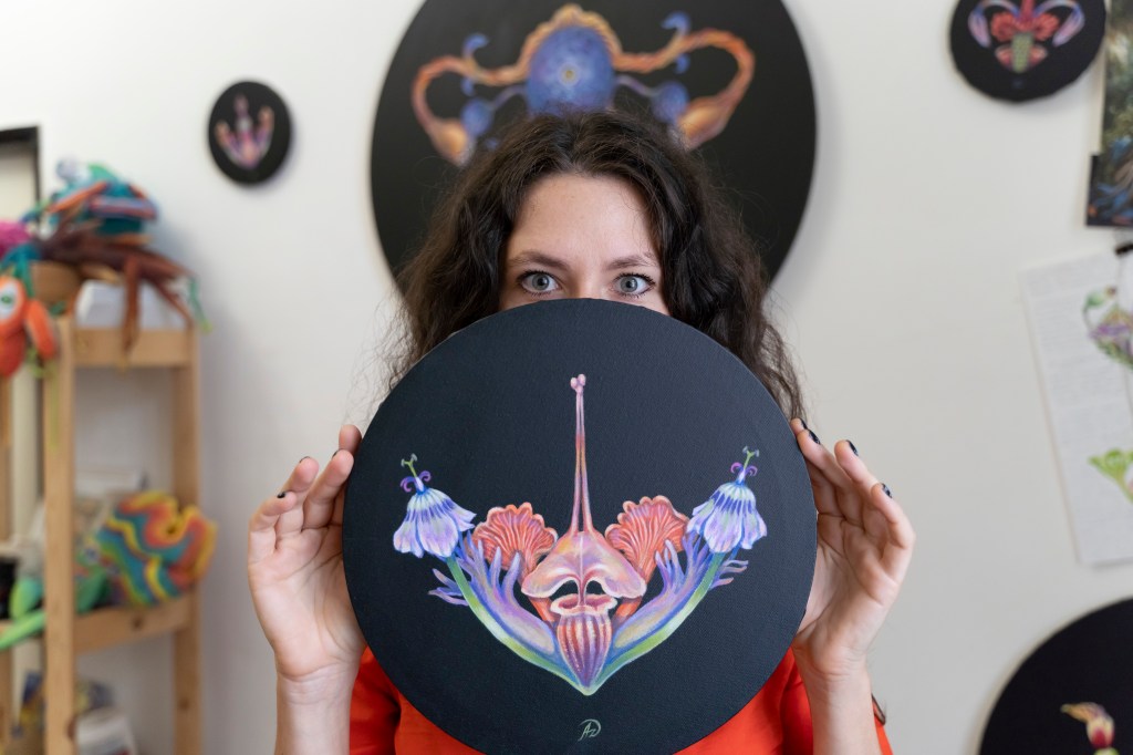 As a woman artist reconnecting with my own nature and the feminine mind of the planet through plant and mushroom medicines, I feel called to celebrate femininity through plant and mushroom beings in my artistic work. Many of my paintings resemble women’s organs made of plants and other organisms. These artworks are often round, with black backgrounds, as if they are universes of dark matter from which nature beings are born.